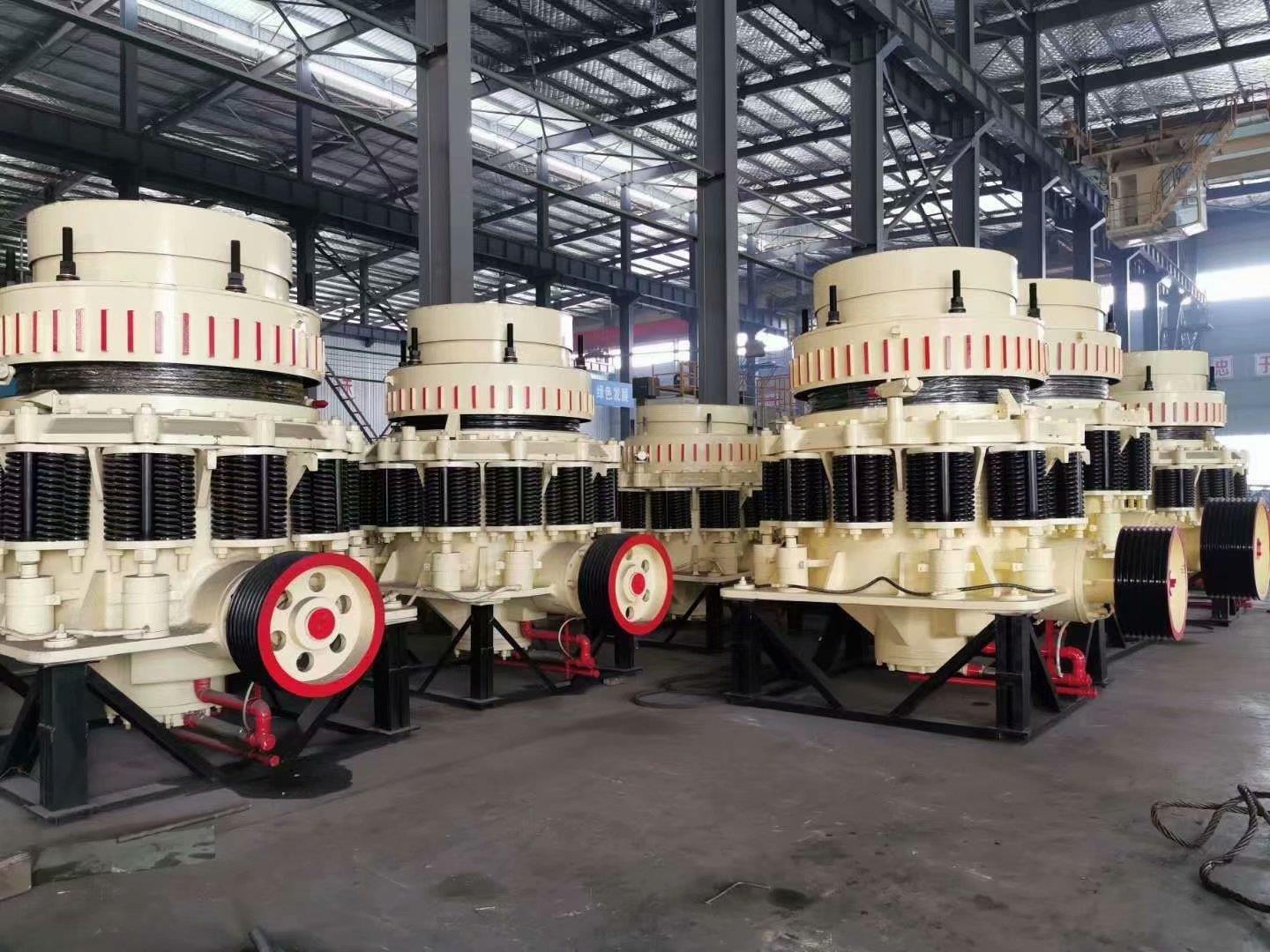 3、对于弹簧圆锥破碎机而言,其排料口尺寸的调节主要是通过调节弹簧来实现的。调节排料口尺寸的不动点是悬挂点与动锥的底点。当需要增大排料口尺寸时,需要松开弹簧;当需要减小排料口尺寸时,则需要拧紧弹簧。
